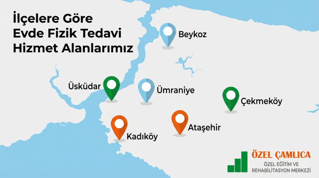 Çamlıca Özel Eğitim ve Rehabilitasyon Merkezi, uzman fizyoterapist kadrosu ile Üsküdar, Ümraniye, Ataşehir, Kadıköy, Beykoz ve Çekmeköy’de çocuk, yetişkin ve yaşlı bireyler için evde fizik tedavi ve rehabilitasyon hizmeti sunar.